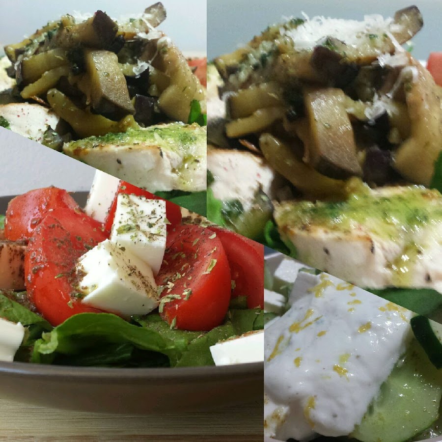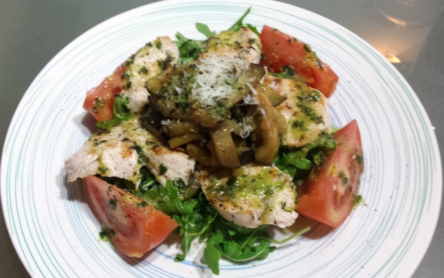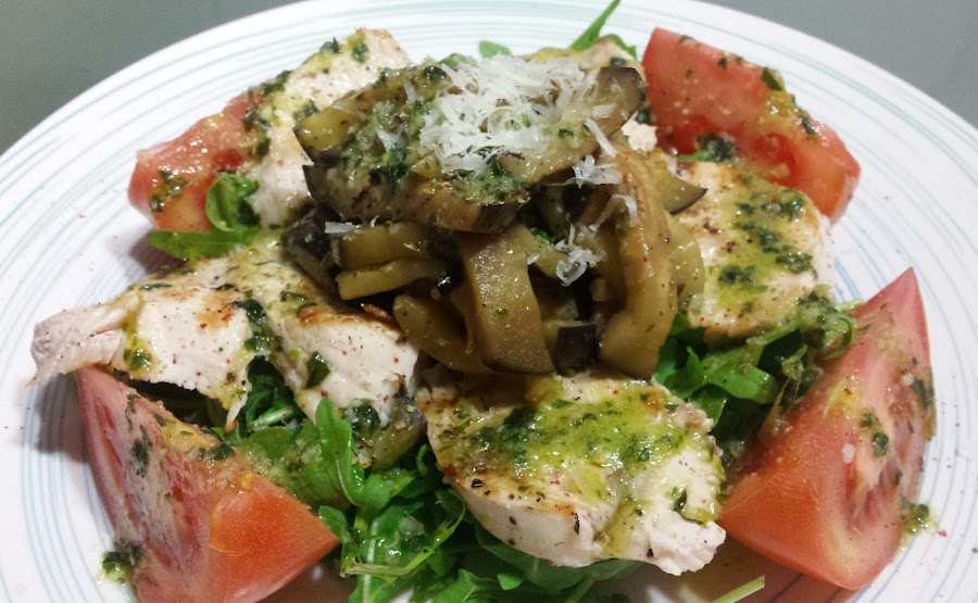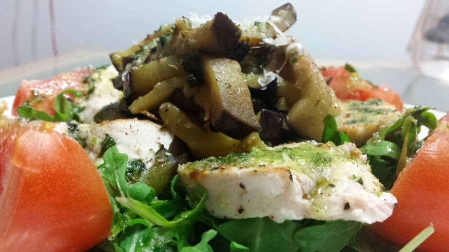 Ensalada Templada de Rucula con Pollo y Berenjena.