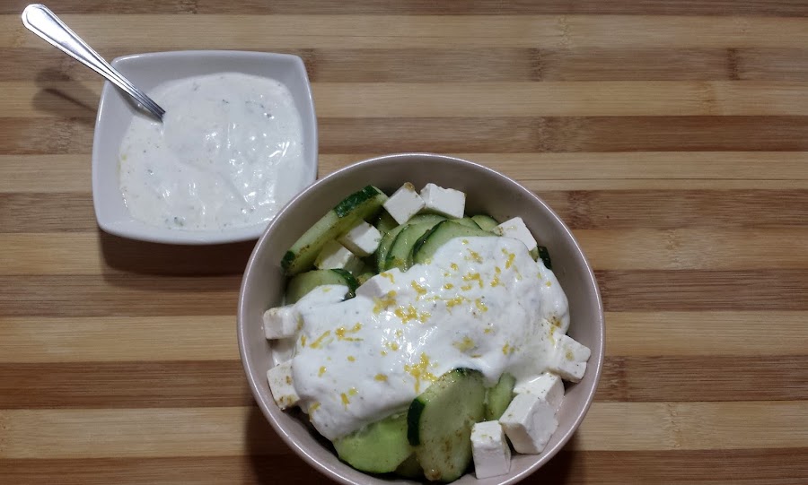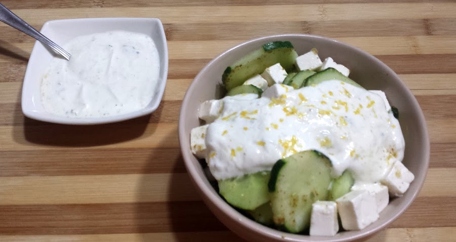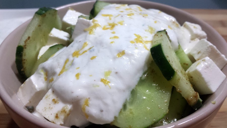 Ponemos el Pepino aliñado en un bol de presentación, le añadimos un par de cucharadas del Yogurt y los dados de Queso feta. Servimos.