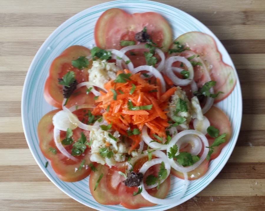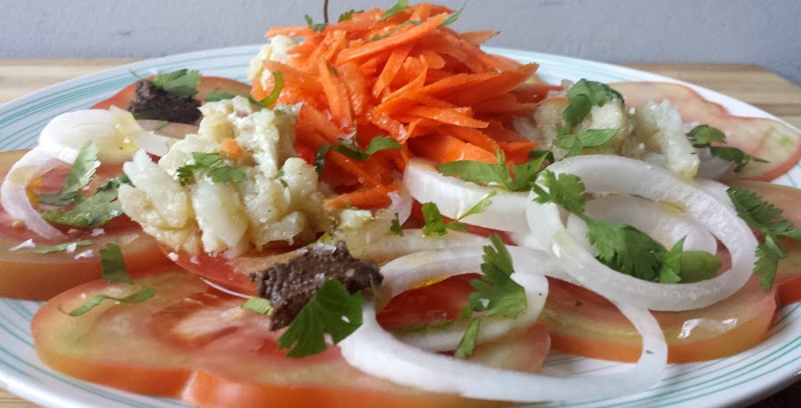 Para montar nuestra Ensalada pondremos en un plato las rodajas de Tomate, la zanahoria rallada en el medio del plato y los aros de Cebolleta esparcidos por encima del Tomate. Añadiremos unas cucharaditas de la pasta de aceitunas negras y 3 ó 4 cucharaditas del Bacalao aliñado que teniamos reservado con anterioridad en el frigorifico.