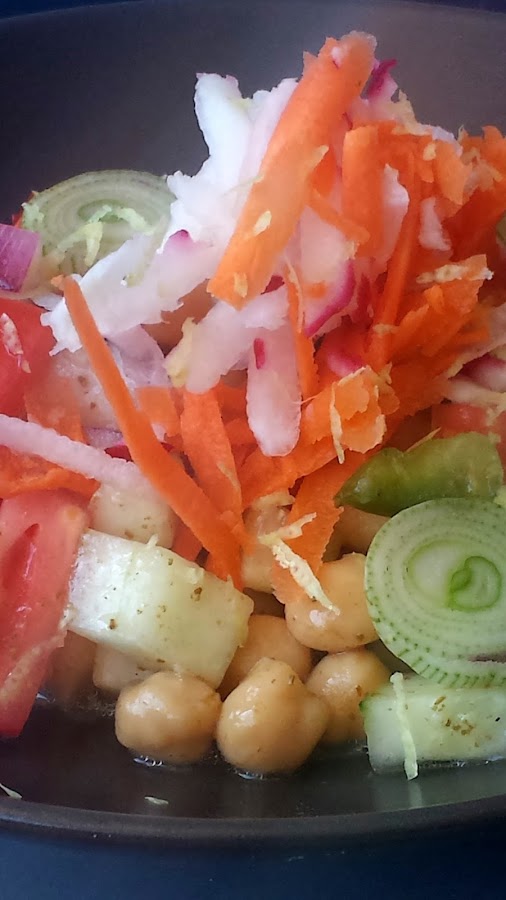 En el bol donde teniamos los garbanzos añadimos el pepino, el tomate, los pimientos y la cebolleta.Salpimentamos al gusto, incorporamos el ajo rallado, añadimos unas dos cucharadas de aceite de oliva, el zumo de limón con su ralladura y los cominos molidos, mezclamos bien todo el conjunto.