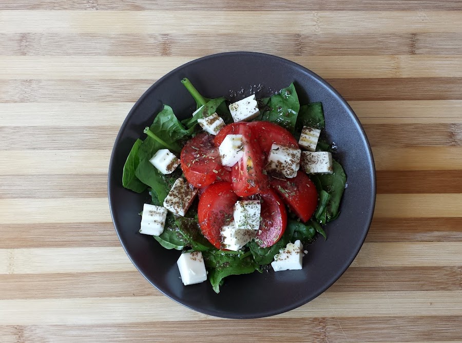 En un plato ponemos unas hojas de Espinacas de base, los gajos de Tomate en el centro y los dado de Queso Fresco alrededor de este, sazonamos con sal maldon y rociamos con el aliño de aceite de aceituna negra.