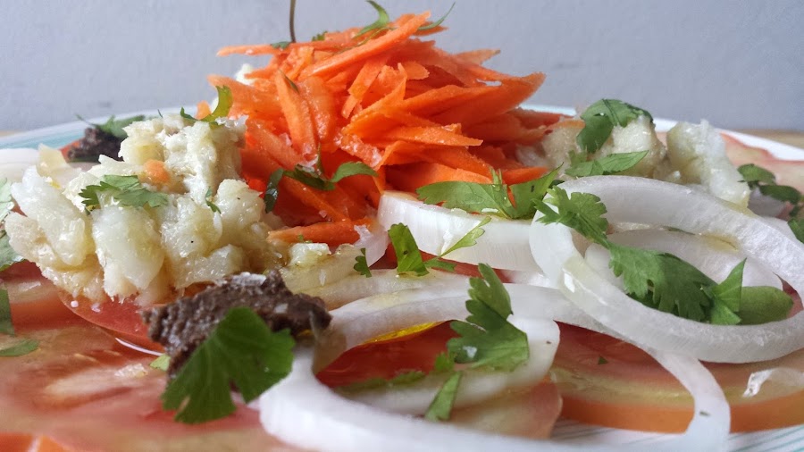 El Bacalao en este caso yo lo saqué de unas espinas que tenía de un Bacalao que compré y me hice un fumet de pescado, al colar las espinas del caldo y dejar enfriar fuí sacando, con cuidado de que no fueran espinas, y poco a poco toda la carne que se queda cerca de estas. Machaqué en un mortero un diente de ajo con un poco de sal y aceite de oliva y aliñé las migas del Bacalao. Lo guardé en el frigorifico hasta la hora de montar la Ensalada.