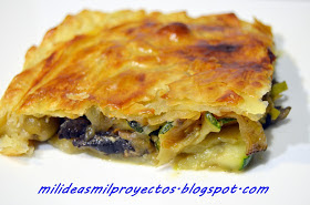Una empanada de hojaldre rellena de unas estupendas verduras para hacer la receta necesitarás calabacín, pimiento, puerro, champiñón, aceitunas, cebolla, aceite, huevos y láminas de hojaldre.
