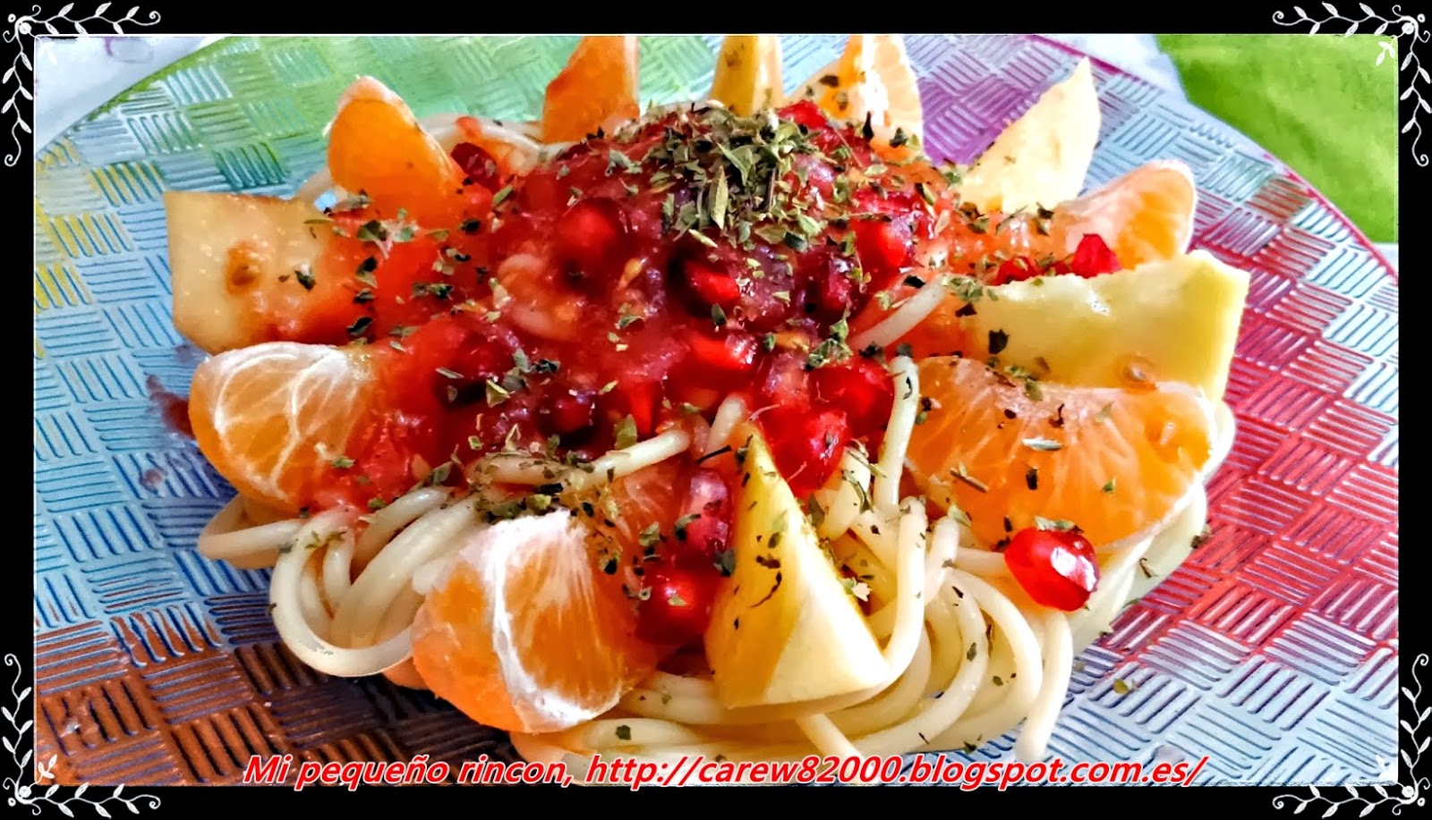 Pelamos y sacamos los gajos de las mandarinas y hacemos lo mismo con las manzanas, colocamos los espaguetis en una bandeja o en platos individuales y vamos colocando las frutas como queramos, ponemos la granada en el medio y los tomates rallados previamente encima y salpimentamos al gusto, podemos preparar la vinagreta previamente o dejar que cada uno se sirva a su gusto.