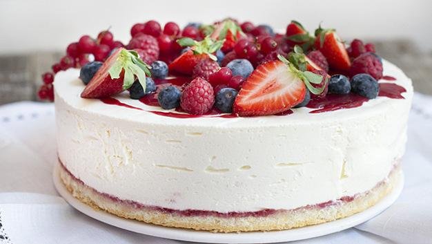 En este caso cubriremos el fondo de un molde con un lámina de bizcocho. Prepararemos por un lado una gelatina con fruto rojos, azúcar y gelatina y por otro lado una mousse de queso con nata (crema de leche) (o crema de leche) y gelatina. Vertemos la mitad del mousse, colocaremos la gelatina y terminaremos con el resto de la mousse. Decoramos con mermelada y frutos rojos.