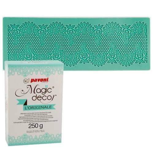 Si, si es posible hacer encaje comestible. Hay unos productos en el mercado que simulan este tejido y quedan muy realistas. Necesitas una plantilla de silicona, una espátula y el producto en sí.