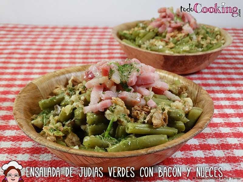 Nuestra amiga Noemí, del blog Todo Cooking, nos enseña a preparar una deliciosa ensalada de judías verdes con bacon y nueces. Para preparar esta ensalada necesitarás los siguientes ingredientes: judías verdes, bacon, cebolla, nueces, hierbas aromáticas y vinagreta de limón. Lo primero que tendrás que hacer para hacer esta receta, es preparar la vinagreta de limón. Después preparar el resto de ingredientes en un bol, tal y como nos explica Noemí en su blog y termina por aderezar con la vinagreta de limón.