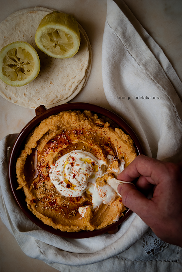 Ahora no hay boniatos, pero lo cambiamos por calabaza sin problema alguno y queda exactamente igual de delicioso. Lo podemos acompañar de pan de pita tostado o incluso de alguna verdura en crudo como pepino y zanahoria.
