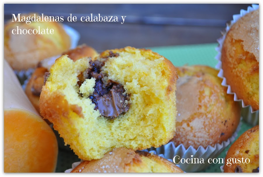 Estas deliciosas y estupendas magdalenas, es del blog Cocina con gusto. Estas magdalenas de calabaza están rellenas de chocolate aportandole estos dos ingredientes un sabor y una textura muy rica. Son fáciles de hacer, sencillas y perfectas para disfrutarlas en el desayuno o la merienda.