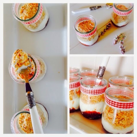 Y siguiendo con preparaciones en vasitos, Chiquirecetas, nos invita a preparar unos postres individuales con queso, galletas y mermelada de higos. Una combinación poco habitual pero que está buenísima. Pasaros por su blog para ver las cantidades.