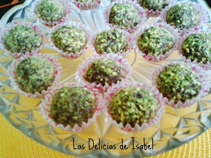 Trufas de chocolate con leche y pistachos. Si hay algo que caracteriza la navidad es el chocolate y los frutos secos. Por ello, las trufas son de sus dulces más típicos. Podéis aprovechar si os ha sobrado cobertura de chocolate de otro dulce para hacerlas. Es tan simple como hacer bolitas de chocolate y pasarlas después por pistacho triturado. Os recomiendo que las coloquéis sobre cápsulas pequeñas de papel para que al cogerlas con las manos no os pringuéis los dedos.