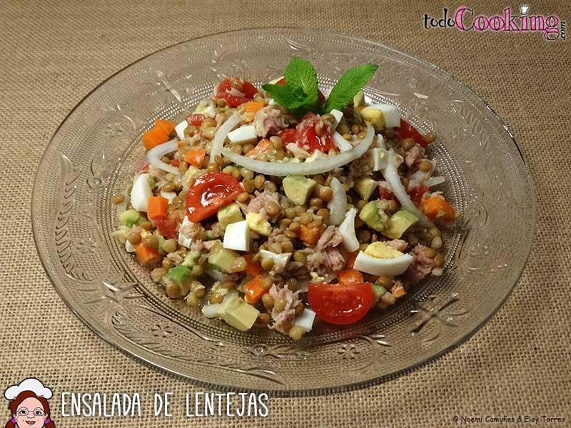 Noemí, del blog TodoCooking, nos enseña a preparar una deliciosa ensalada de lentejas con aguacate, zanahoria y atún. Los ingredientes que necesitarás para preparar esta ensalada, son: lentejas, atún en aceite, cebolla, tomates, aguacate, zanahoria, huevo, queso fresco, zumo de limón, sal, vinagre de vino y aceite de oliva.