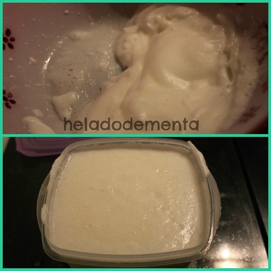 Ahora es el turno de los huevos. Batimos las claras a punto de nieve y se la añadimos a la mezcla que tiene que esta un pelín congelada. Lo batimos todo bien para que se mezcle.