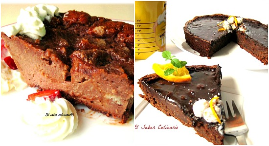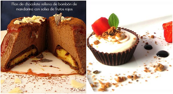 Flan de chocolate relleno de bombón de mandarina con salsa de frutos rojos