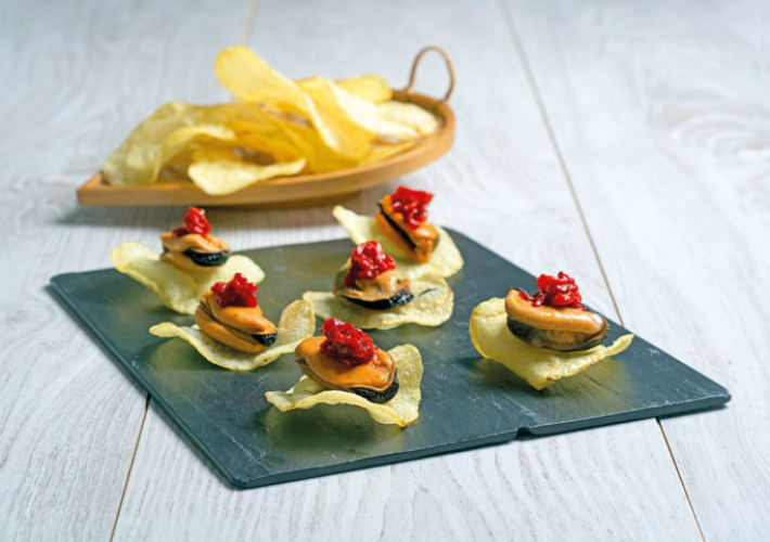 Aquí tenemos otra receta con mejillones y patatas de bolsa. La receta consiste en montar el bocadito sobre patata chip, poniendo el mejillón bien escurrido. Taparlo con una crema hecha a base de mayonesa, queso fresco y el jugo del escabeche. Finalmente cubrir el mejillón con otro chip de patata.7.-Mejillones con aguacate
