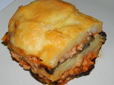 La moussaka normalmente lleva, berenjenas, carne, bechamel y yogur en sus ingredientes básicos. Yo le añadí patatas y le quité la bechamel, la verdad un plato distinto pero también divino.
