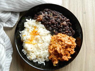 Esto lo denomino un Pabellón Criollo express. El Pabellón Criollo, es un plato típico venezolano, lleva frijol negro (caraotas), arroz, y carne mechada como ingredientes básicos. Luego de allí se puede poner queso, huevo, arepitas, aguacate, etc. Para este plato típico, como dicen por allí, “en los gustos, los colores”, cada quien el pone su toque.