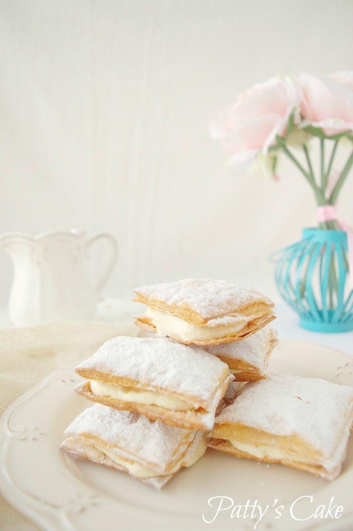 Cortamos el hojaldre en rectángulos, forramos la bandeja con papel de horno y ponemos los rectángulos, horneamos, rellenamos con crema pastelera y expolvoreamos con azúcar glass.