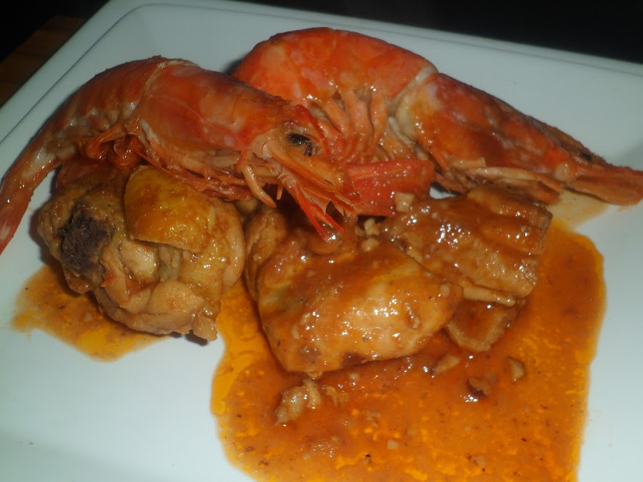 Una de las ventajas que tiene el pollo es que lo podemos hacer a diario, como un día de fiesta. Como es el caso de esta receta que nos ofrece el blog Cocinando con Montse: Pollo con gambas ( Mar y montaña )