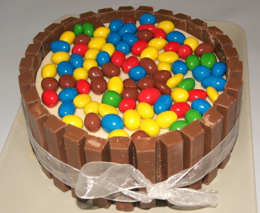Ingredientes: 3 planchas de bizcocho o un bizcocho de 24 cms cortado en tres discos (si no tenéis mucho tiempo podéis comprarlo en supermercados ya preparados), 400 ml. de nata (crema de leche) liquida para montar (35% m.g.), 6-8 cucharadas soperas de dulce de leche, kit kat (los necesarios para rodear toda la tarta) y una bolsa de M&M de colores.