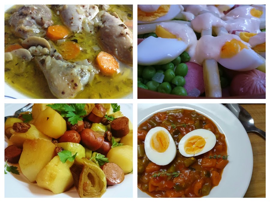 Platos de cocina diaria, recetas dulces y saladas con una gran variedad de guisos, legumbres, carnes, platos de verduras,pastas, tartas, bizcochos y postres. Todos con productos de temporada, platos riquísimos a buen precio. Además, nos reconfortan y nos ayudan a recargar las energías.