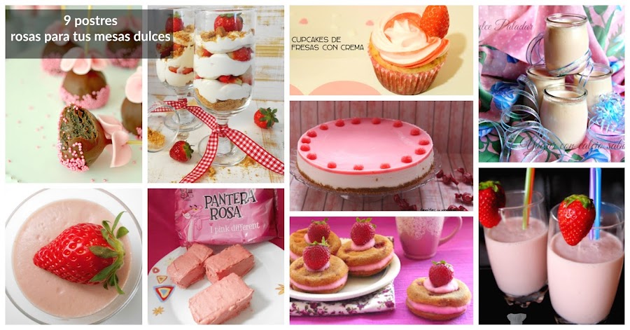 Hoy os he querido mostrar un montón de recetas, nada menos que nueve postres, en las que el color rosa predomina y con las que podréis montar una mesa dulce inolvidable. Formatos individuales, tartas, cupcakes, cake pops, whoopie pies, batidos, yogures,... Todo ideal para los peques y para los no tan peques.