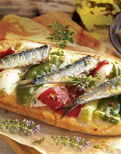 Uno de los clásicos platos con sardinas es la coca de sardinas y verduras asadas.