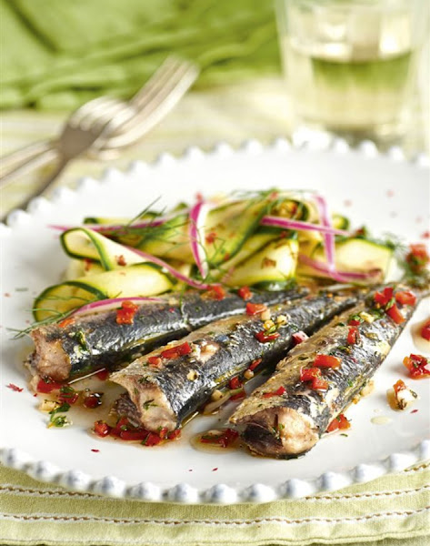 Unas láminas de calabacín muy finas cortadas, bien salteadas en la sartén o a la parrilla, acompañadas con una lata de sardinas en aceite de oliva. Y para decorar un picadillo de pimiento rojo y tiras finitas de cebolleta morada.