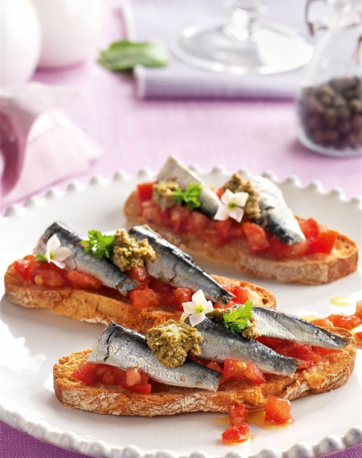 Una original tostada de tomate con sardinas. Ponemos el tomate en daditos y añadimos un paté de olivas. Para hacerlo, solo tienes que picar y mezclar un puñado de aceitunas con anchoa, un poco de ajo picado, un par de almendras, y aceite de oliva.