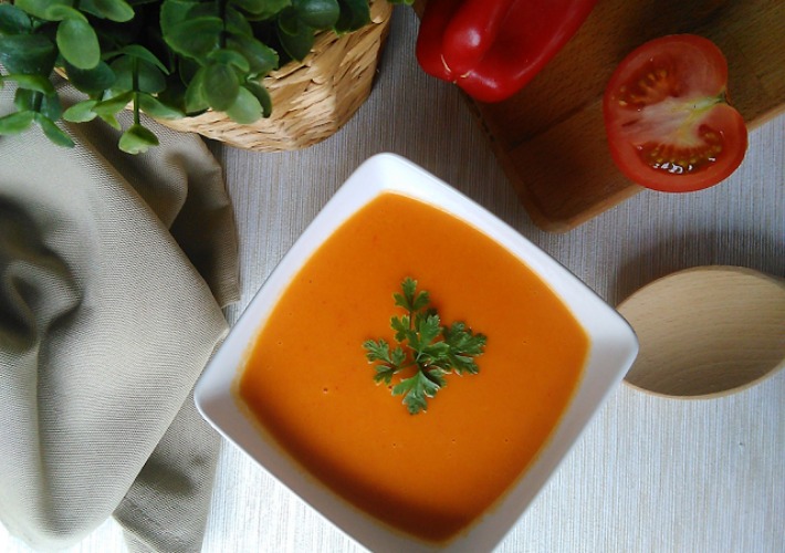 Recupero esta receta que compartí con vosotros hace ya un año. Lo cierto es la crema de calabaza me parecía demasiado dulce e insípida, así que introduzco ingredientes que le aportan más sabor como el pimiento rojo asado. La receta completa la puedes encontrar aquí.