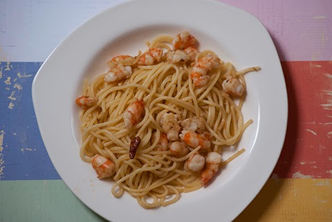 Jesús, apuesta por la cocina sencilla. Un rico plato de espaguetis con langostinos y guindillas. Cocinamos la pasta y la salteamos con los langostinos y las guindillas. Para el el resto de los ingredientes y trucos: (Aquí)Rollitos de mozzarella y albahaca