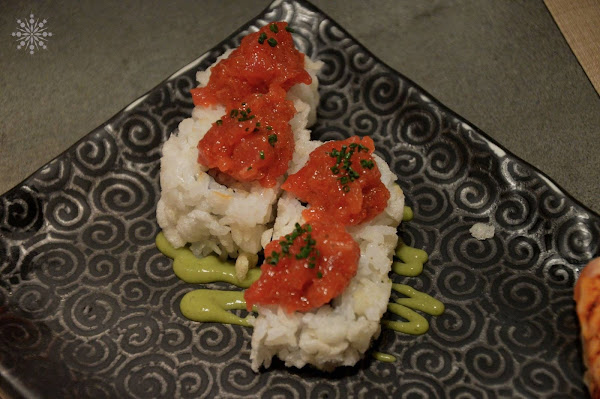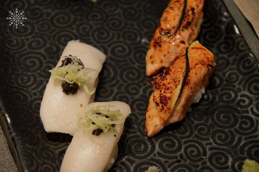 A continuación, un plato variado de diferentes piezas: Nigiri de salmón flambeado con lima, Nigiri de pez mantequilla con trufa y Matsuri (rollo de aguacate y atún picante con salsa de jalapeños y crujiente de arroz).