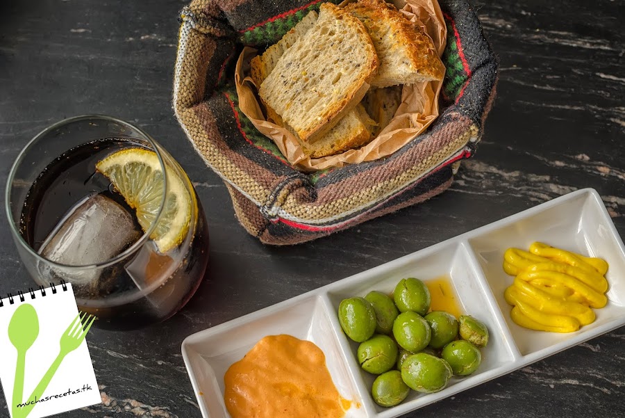 Empezamos con un pequeño aperitivo, compuesto de dos aliolis, uno de azafrán y otro de pimiento de piquillo, acompañados de unas "olivicas partías". Ambos aliolis tienen un sabor muy suave y fresco. Buen comienzo para abrir boca.