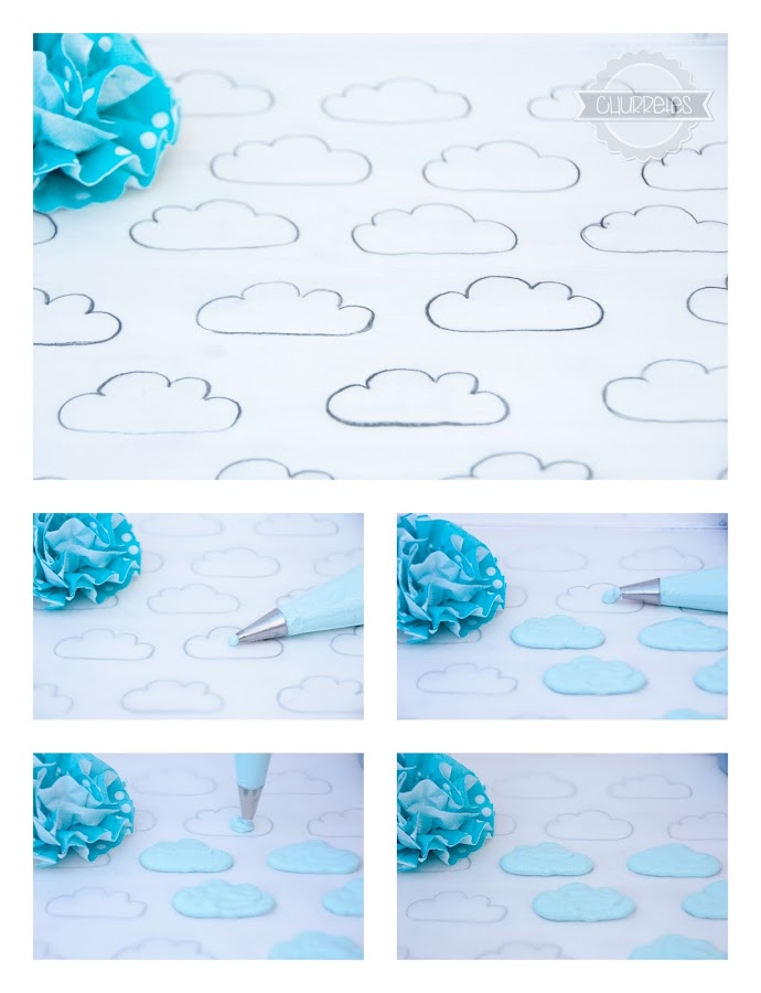 - La masa del macaron se pone sobre el delimitado de la nube con ayuda de la manga pastelera con boquilla redonda del número 6 Wilton o 16 PME, habrá que ponerla de forma perpendicular en el centro del dibujo sin tocar el papel, presionarla con suavidad y de forma constante del centro hacia afuera... cuidado de no pasarse de la línea, dejar de presionar y retirar la manga al mismo tiempo.