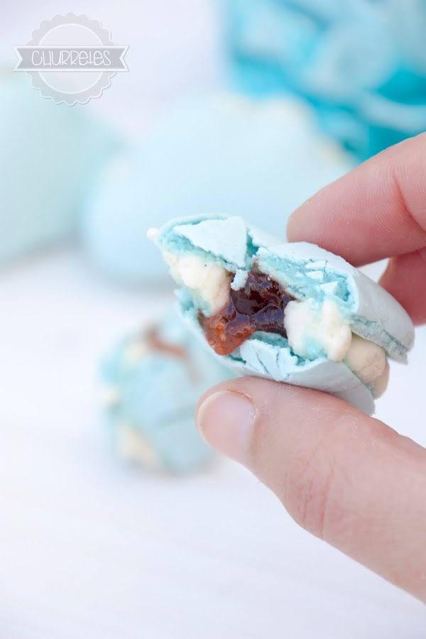 Directamente caídas del cielo, para que los humanos podamos disfrutar de lo divino, llegan estas Nubes de Macarons rellenas de Crema de Vainilla y Mermelada de Fresa... y no sólo tienen un bonito color azulado, sino que además huelen (ya de paso nos hacemos una idea de a qué huelen las nubes y podemos responder a la pregunta que el famoso anuncio nos hizo durante años) y saben a gloria bendita.