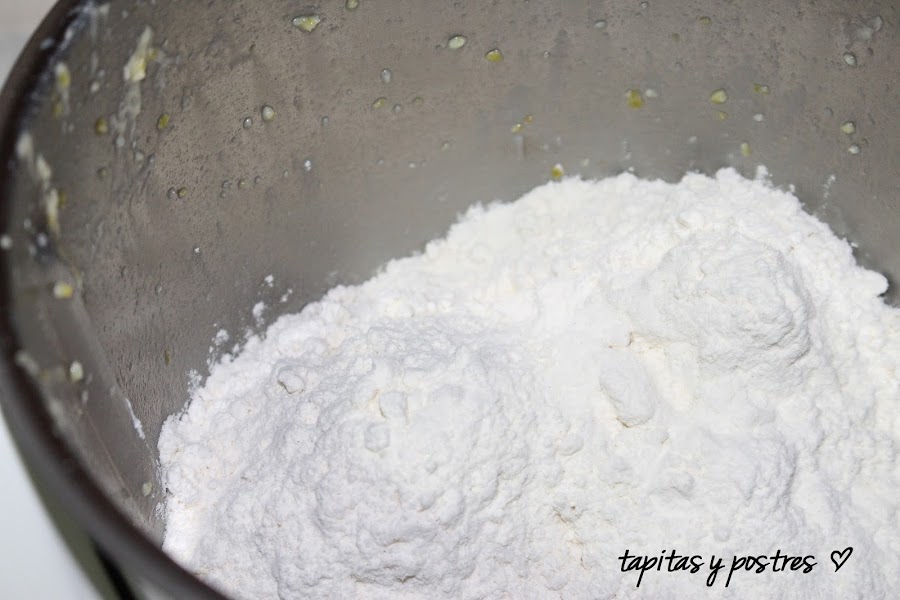 Incorporar la mitad de la harina y mezclar 15 segundos a velocidad 6