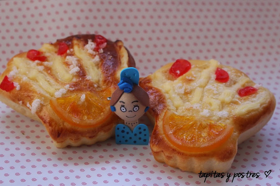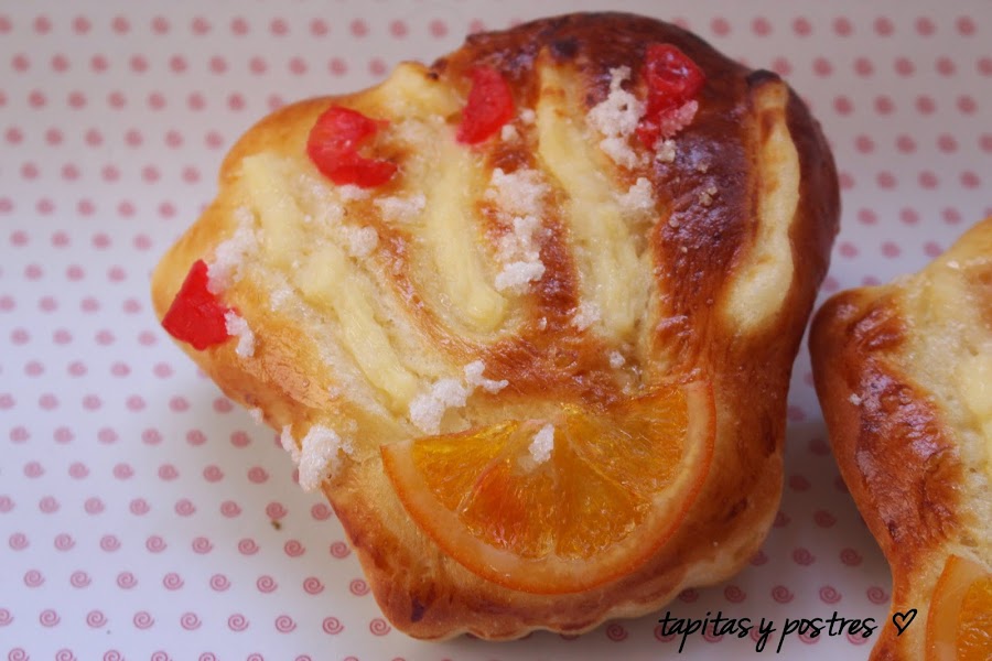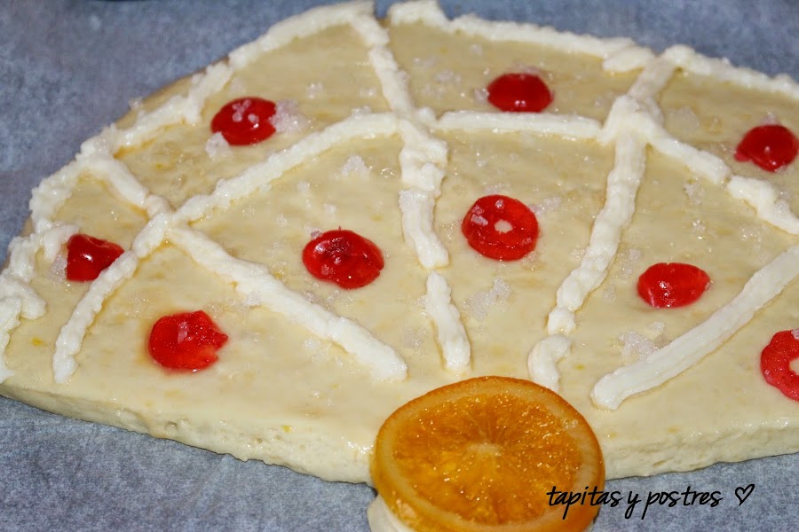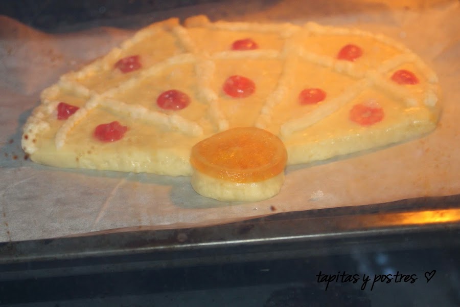 Cuando la masa ya ha crecido, pincelamos con huevo batido, decoramos y con la crema pastelera reservada hacemos las varillas del abanico. En el pico inferior colocamos una rodaja de naranja y trocitos de guindas entre la crema pastelera. Esparcir una cucharadita de azúcar remojada con unas gotas de agua.