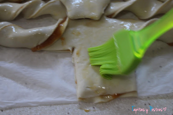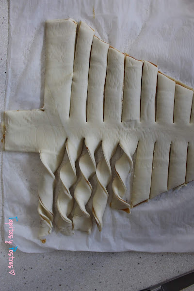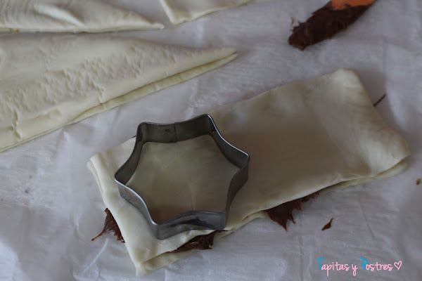 Cada ramita la vamos a "retorcer" y pintamos con huevo batido. Con los recortes que van sobrando hacemos estrellas. Yo hice estrellas con relleno de crema de turrón y crema de cacao, que ya sabéis que turrón y chocolate son dos mezclas que funcionan muy bien.