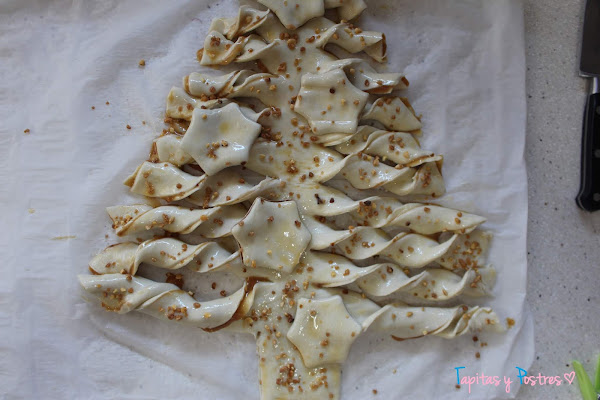 Colocamos algunas estrellas en el abeto y pintamos con huevo batido.