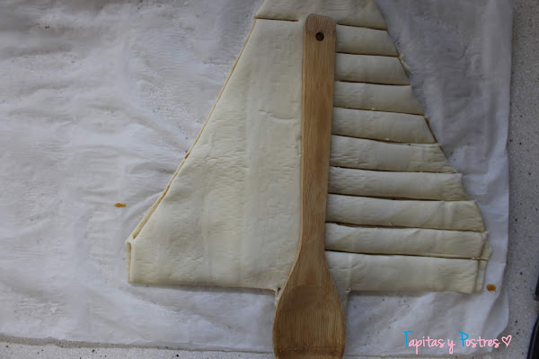 Ahora vamos a formar las "ramas". Yo coloco una cuchara o paleta de mango ancho para marcar el centro y a partir de ahí hacemos cortes horizontales desde arriba hasta abajo (en las fotos se ve mejor).