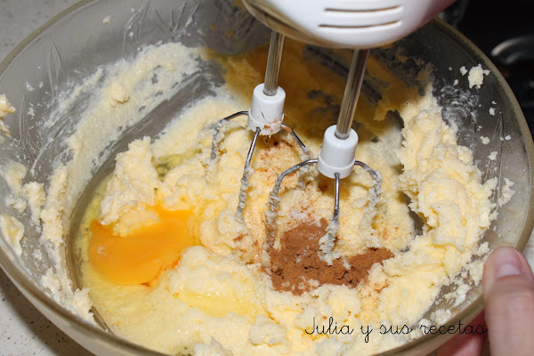Batimos la mantequilla a temperatura ambiente con el azúcar, añadimos el huevo, batimos, añadimos la harina tamizasa con la levadura y mezclamos.