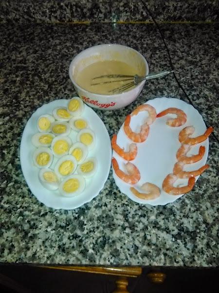 en un cazo ponemos a hervir agua suficiente como para que los huevos queden cubiertos añadimos un chorrito de vinagre y un poco de sal , con eso conseguiremos que una vez cocidos se pelen sin dificultad, introducimos los huevos y los mantenemos unos 7 minutos, los enfriamos los pelamos y los reservamos, a continuación pelamos los langostinosa dejándoles la colita, los reservamos también .En un bol ponemos el huevo lo batimos añadimos la sal y un chorrito de sifón o gaseosa ,vamos poniendo la harina hasta conseguir una mezcla no muy espesa .