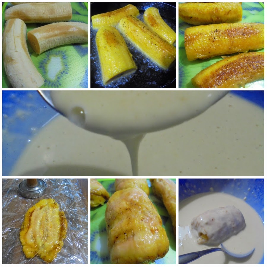 Rebosamos nuestros plátanos en la masa y freímos hasta que doren.