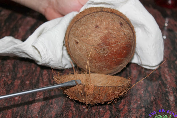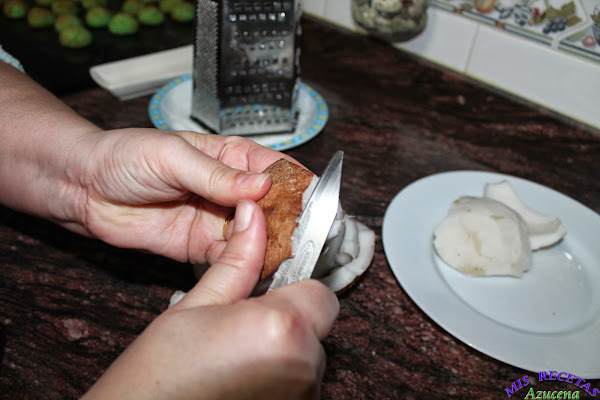 Una vez tengamos toda la carne del coco la lavaremos y le quitaremos la piel, yo os aconsejo que se la quitéis cuando el coco esta aún caliente es más fácil.