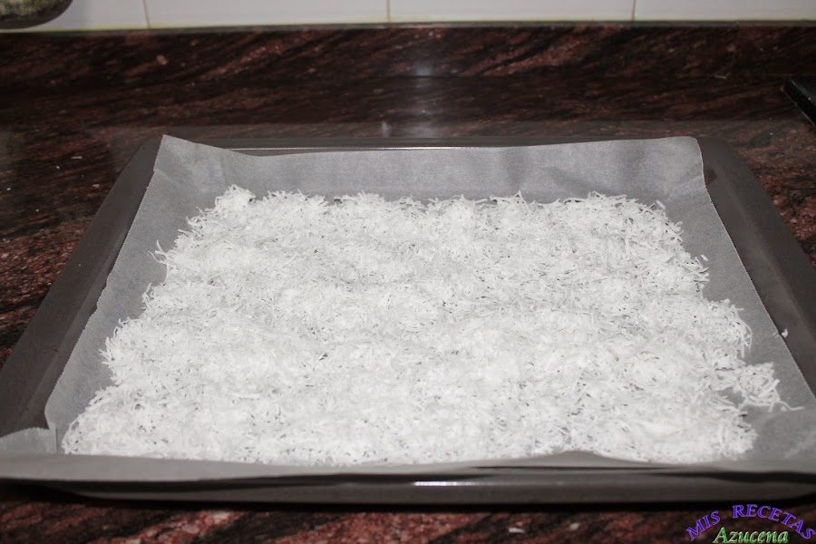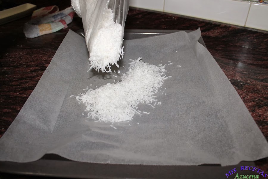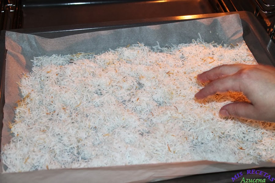 Aquí no pongo tiempo, puede variar dependiendo de la cantidad de coco, pero como cada minuto tenemos que abrir el horno y remover todo el coco nos daremos cuenta cuando está listo, cuando este suelto y se quiera empezar a poner dorado.
