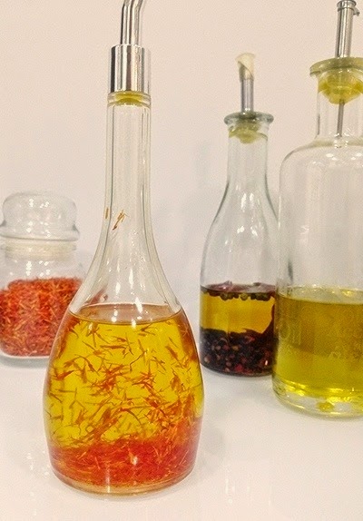 Hace unos cuantos días publiqué un post colaborativo "Recetas con azafrán y mucho aroma" que incluía unas cuantas recetas de amigos blogueros. Y como sabéis soy aficionada a los aceites aromatizados, cada año preparamos unos cuantos, me encantan!