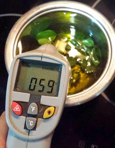Os dejo una imágen cedida por Iván, elaborando aceite con "menta", donde se ve claramente el proceso de infusión con calor y la temperatura.