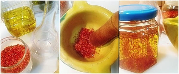 En el mortero machacamos el azafrán, y lo pasamos a un bote de cristal con el aceite de oliva virgen, lo cerramos
