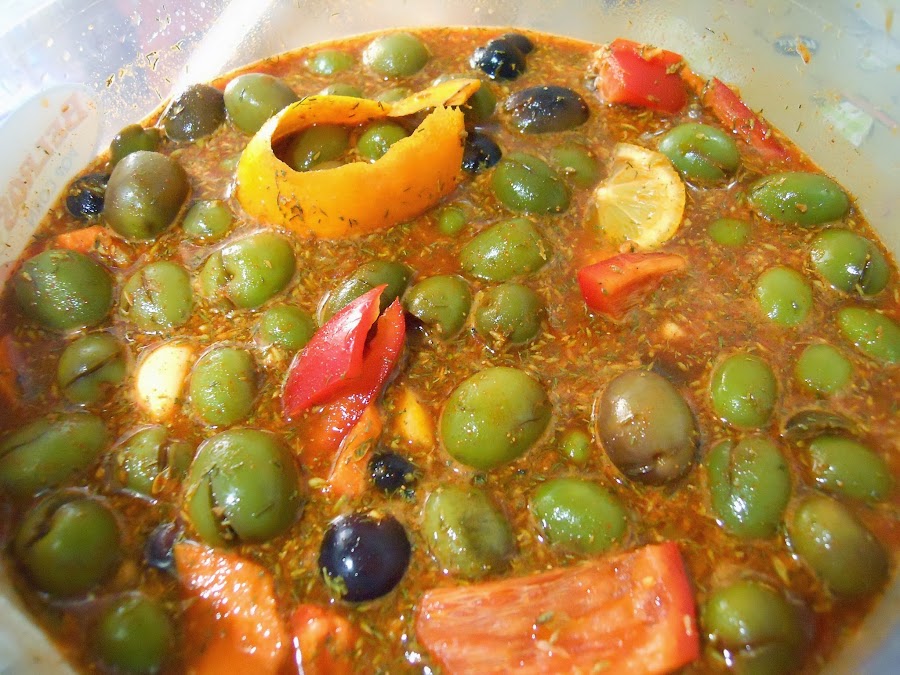 aceitunas( yo use los de las palomitas de plástico) echamos las aceitunas, el pimiento a trozos , la zanahoria a rodajas, el limón, el eneldo la cascara de la naranja, los ajos enteros (podéis añadirle mas ajos también si os gusta), y la mezcla que batimos anteriormente, lo meneamos todo bien y en una semanita podremos comerlas , cuanto mas tiempo estén mas sabor cojeran, evidentemente.