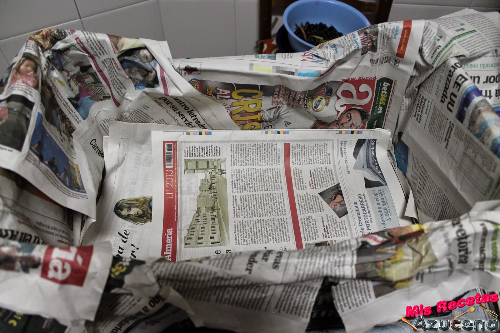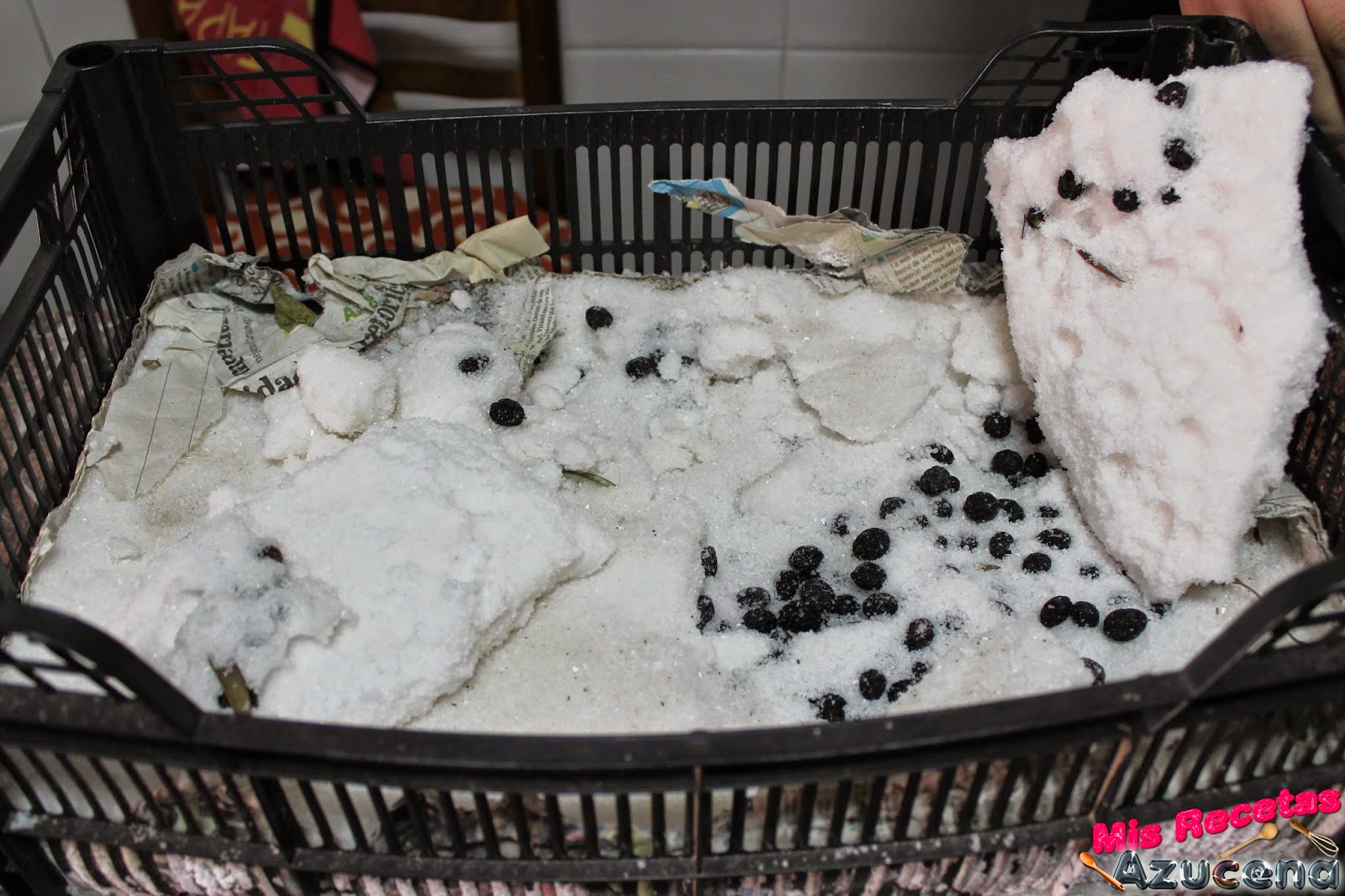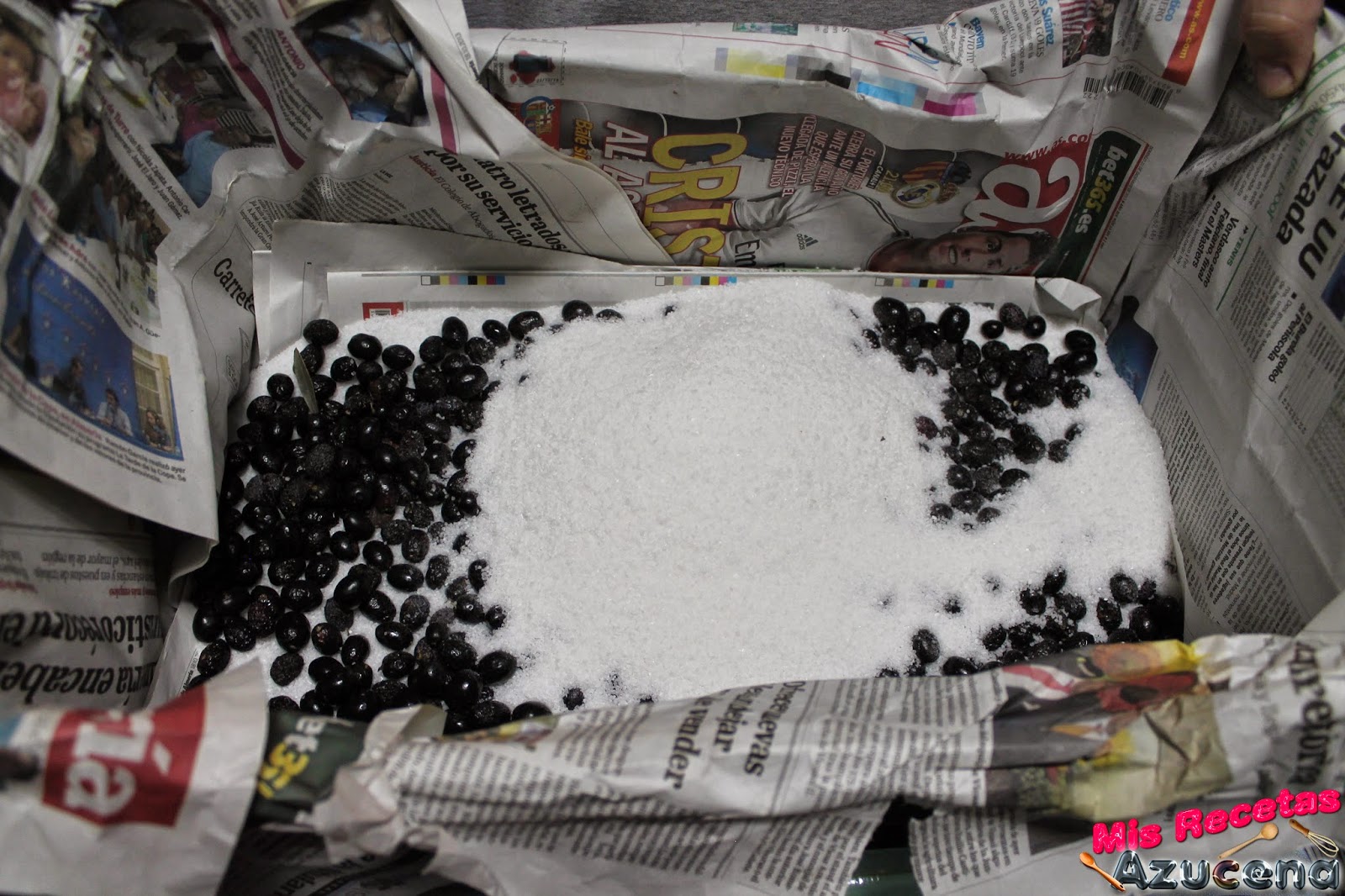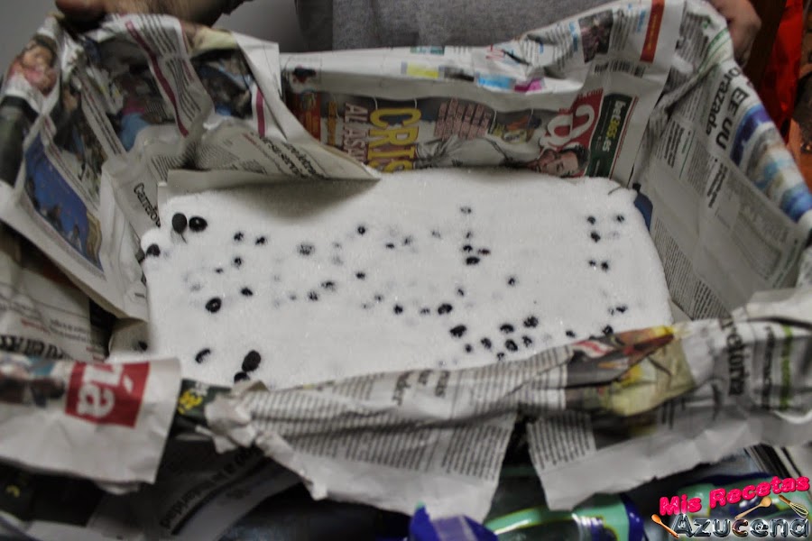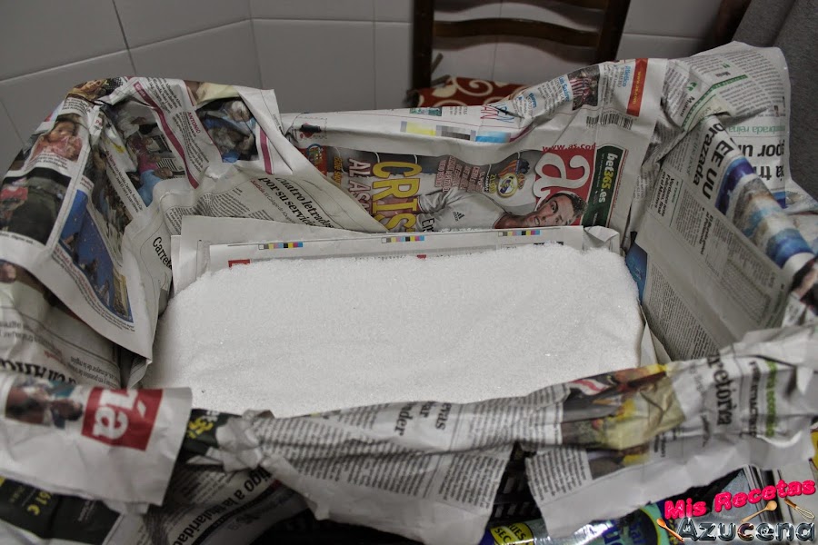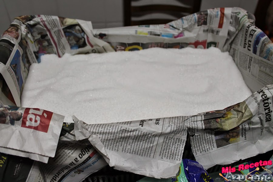 Forraremos la caja con papel de periódico y le ponemos una base con bastante papel, a continuación pondremos una capa de sal de unos dos dedos de grosor.
